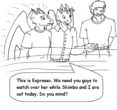 Doggy Days. Espresso is a very happy, very active smooth collie owned by a friend Da'al introduced us to a couple of years ago. Since we have a nice, big yard, when Da'al and "Skimba" wanted to go on a day trip to Victoria, BC, they asked if we could watch her. Thus the inspiration for this and at least one more strip. Espresso is the first dog I've had the joy of spending time with who actually fetched, obeyed "sit", and would play tug of war! More fun later! I hope to have another strip up next weekend. In the meantime, Fly High! ~Kathi |